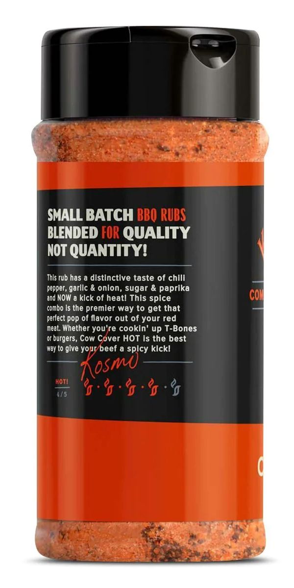 Nejlepší způsob, jak popsat toto BBQ koření, by byla „červené a bohaté„. S výraznou chutí chilli papričky, česneku a cibule, cukru a papriky je tato báječná kombinace koření tím nejlepším způsobem, jak z vašeho červeného masa dostat tu dokonalou chuť. Ve srovnání s podobným BBQ kořením Cow Cover má extra šmrnc, aby se vaše maso dostalo o další stupeň výš. Ať už připravujete T-bone steaky, hamburgery nebo dokonce „londýnské grilované maso“ (London Broil), Cow Cover HOT je nejlepší způsob, jak získat z hovězího masa co nejvíce chuti.