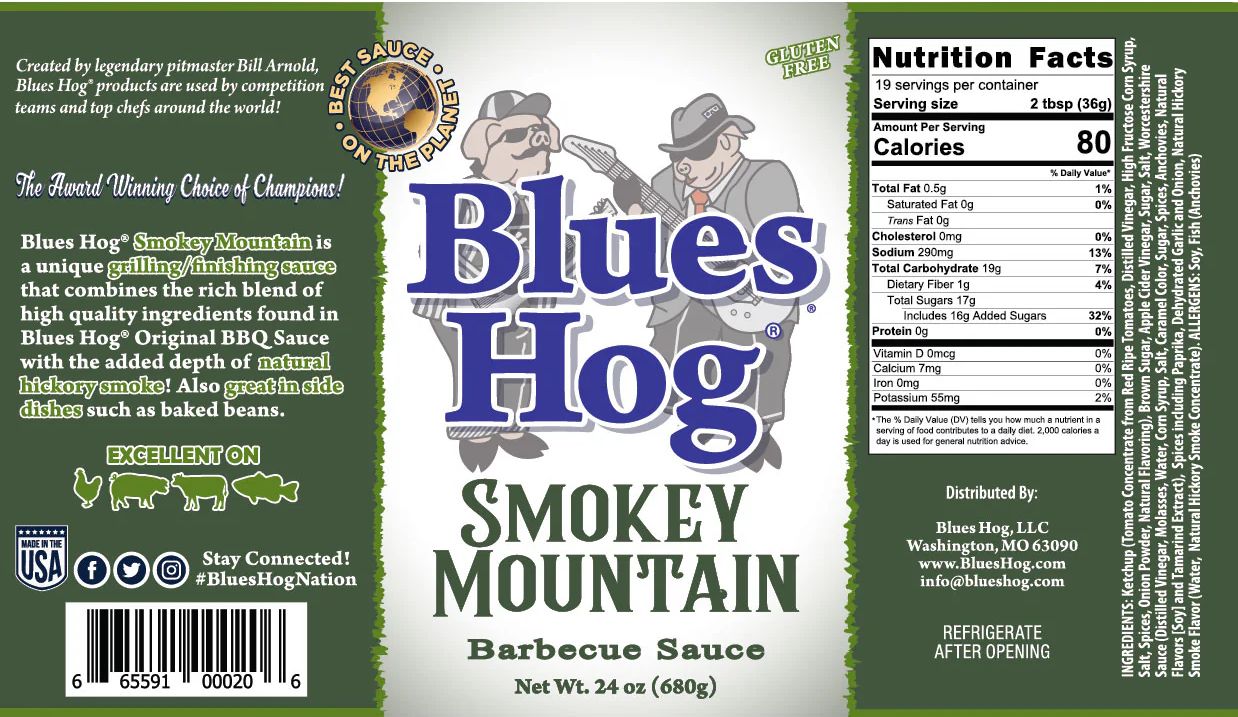 Blues Hog Smokey Mountain je jedinečná grilovací přílohová omáčka, která kombinuje bohatou směs vysoce kvalitních ingrediencí obsažených v omáčce Blues Hog Original s přidáním přírodního hickory kouře. Hog Smokey Mountain je vynikající potírací omáčka pro kuře, žebra, vepřové maso, hovězí maso a lze jej použít v přílohách jako jsou fazole!