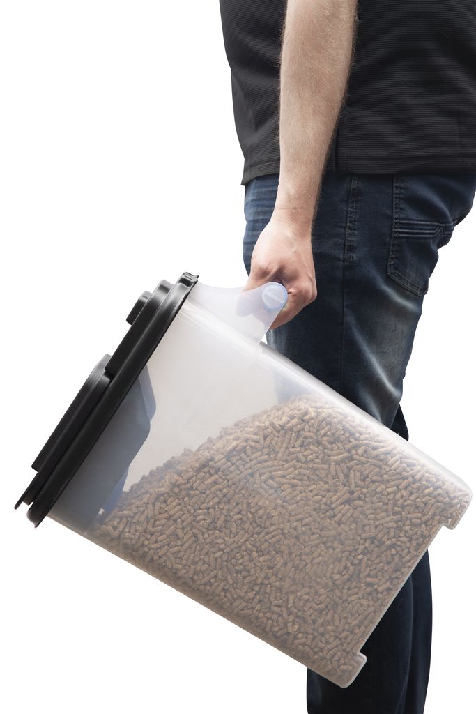Skladujte palivo na pelety správným způsobem – v zásobníku. Pohodlná rukojeť pro velké zatížení a výklopná násypka usnadňují vysypávání pelet. Pokud otevřete celý poklop boxu můžete pelety nabírat pomocí lopatky k tomu určené (není součástí balení). Tento kontejner byl navržen tak, aby pojal přesně jeden pytel paliva – pelet (cca 9 kg). Box na pelety můžete uložit pod zásobník na pelety u peletového grilu Broil King  a použít jej ke sběru pelet z výsypného otvoru na zadní straně grilu.