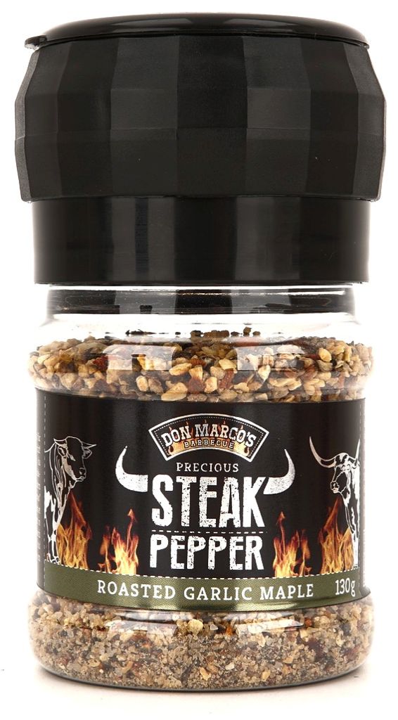 Máte rádi česnek? Pak je tu váš ideální steakový pepř! Pro Don Marco’s Barbecue Precious Steak Pepper Roasted Garlic se používají pouze vysoce kvalitní ingredience z celého světa. Pečený česnek z Rakouska, pepř Telicherri z přírodní rezervace Periyar (Indie), pražené papričky chipotle z Mexika a javorový cukr z Kanady vyvolávají přímo explozi česnekové chuti, která nemá obdoby. Přitom nepotlačuje původní chuť masa!