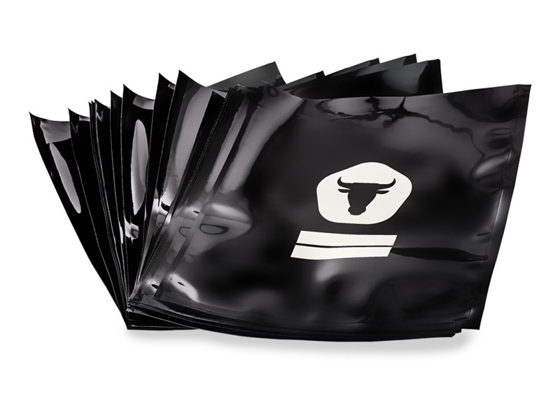 Extra silné (tl. 160 µ) černé vakuovací sáčky s potiskem pro vakuování vyzrálého masa.