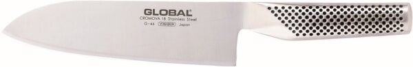 Japonský nůž SANTOKU Global s 18 cm čepelíExtrémně ostrá čepel v kombinaci s dokonalým vyvážením (rukojeť je naplněná křemičitým pískem) a nízkou hmotností zajišťují bezchybnou a bezpečnou práci. Všechny japonské nože Global jsou 100% vyráběny v japonské prefektuře Niigata a ručně broušeny v úhlu 15°. S tvrdostí oceli 56-58 HRC nabízí ideální rovnováhu mezi ostrostí a robustností. S náležitou péčí vám tento nůž bude sloužit celý život.