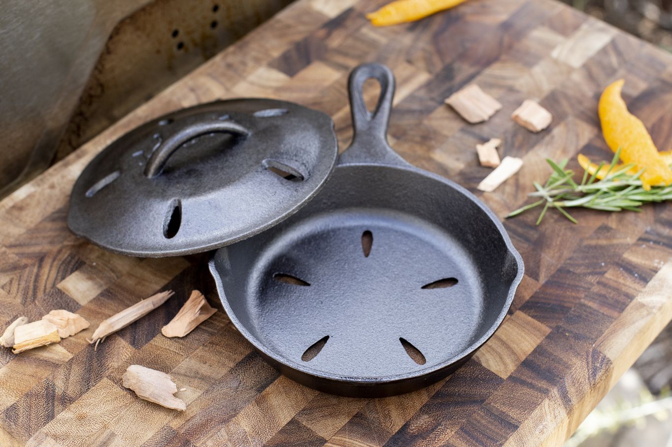 Litinová děrovaná pánev Lodge 16 cm s děrovanou pokličkou je navržena pro grilování s intenzivní kouřovou chutí. Díky větracím otvorům v pokličce totiž proniká k jídlu optimální množství kouře a aroma. Má průměr cca 16 cm, nízkou výšku a váží přibližně 1 kg, což zajišťuje rychlé zahřátí i snadné přenášení při použití na grilu nebo otevřeném ohni.