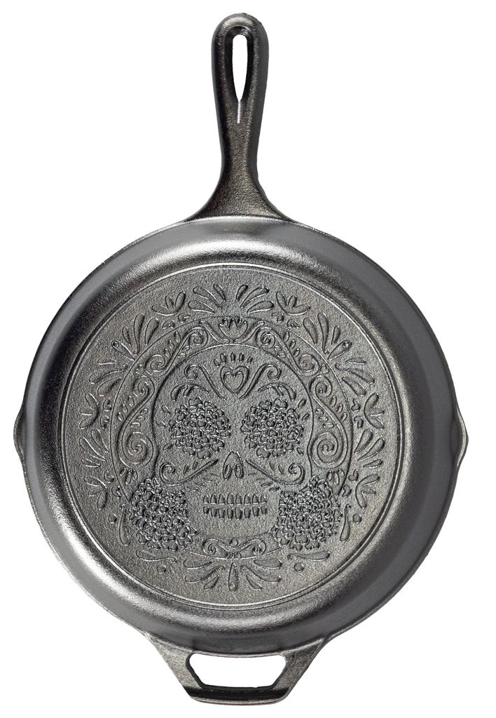 Tato litinová pánev Lodge 26 cm Sugar Skull s výrazným reliéfem lebky z mexické tradice Día de los Muertos je nejen stylovým doplňkem, ale také funkčním nádobím. Má vnější průměr dna 20 cm, vnější průměr u horního okraje 26 cm, výšku cca 5 cm a váží 2,4 kg. Vyrobená je v USA z litiny a s přírodním povrchem ze zapečeného sójového oleje, nabízí vynikající tepelnou vodivost a akumulaci. Maso připravíte i při zaplnění celé plochy bez tolik známého ochlazení slabých hliníkových pánví.