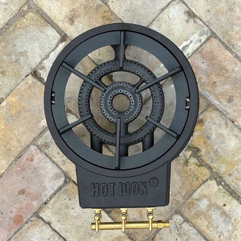 Hořák je vyroben z litiny a vybaven odolným mosazným ventilem, který nabízí vysokou spolehlivost a dlouhotrvající výkon – i při intenzivním používání. Je to klasická a efektivní volba, když potřebujete jednoduchý, ale silný plynový hořák na nádobí wok nebo velké hrnce.