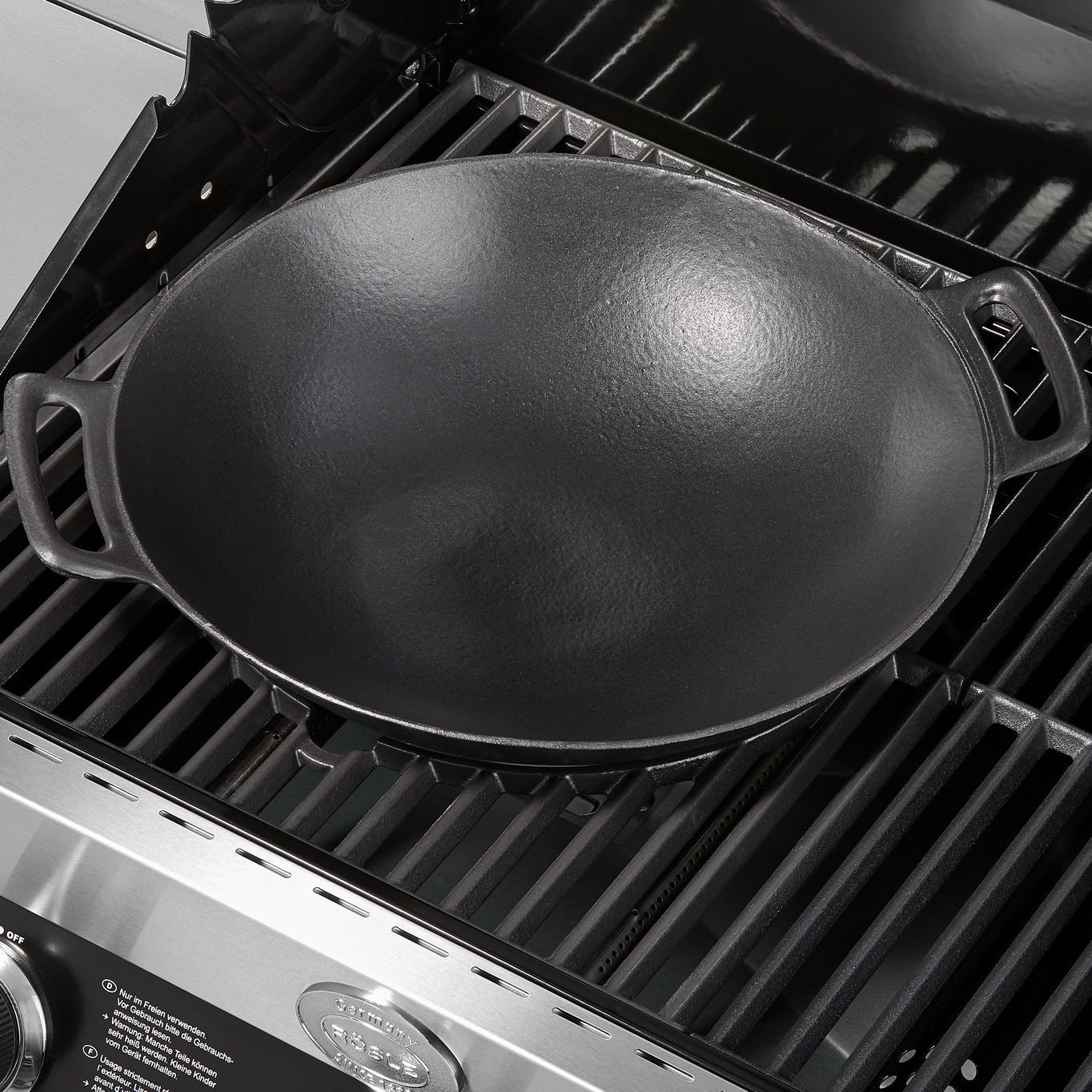 Milovníci asijských pokrmů nedají dopustit na wok pánev o průměru 36 cm pro přípravu dechberoucích pokrmů s rýží nebo nudlemi. Pánev je kompatibilní se všemi grily RÖSLE se systémem Vario+. Materiál ze smaltované litiny se postará o perfektní vedení tepla. Uplatnění najde i v kuchyni – ploché dno pánve zajišťuje použití nejen na grilu, ale také na varných deskách (včetně indukční).